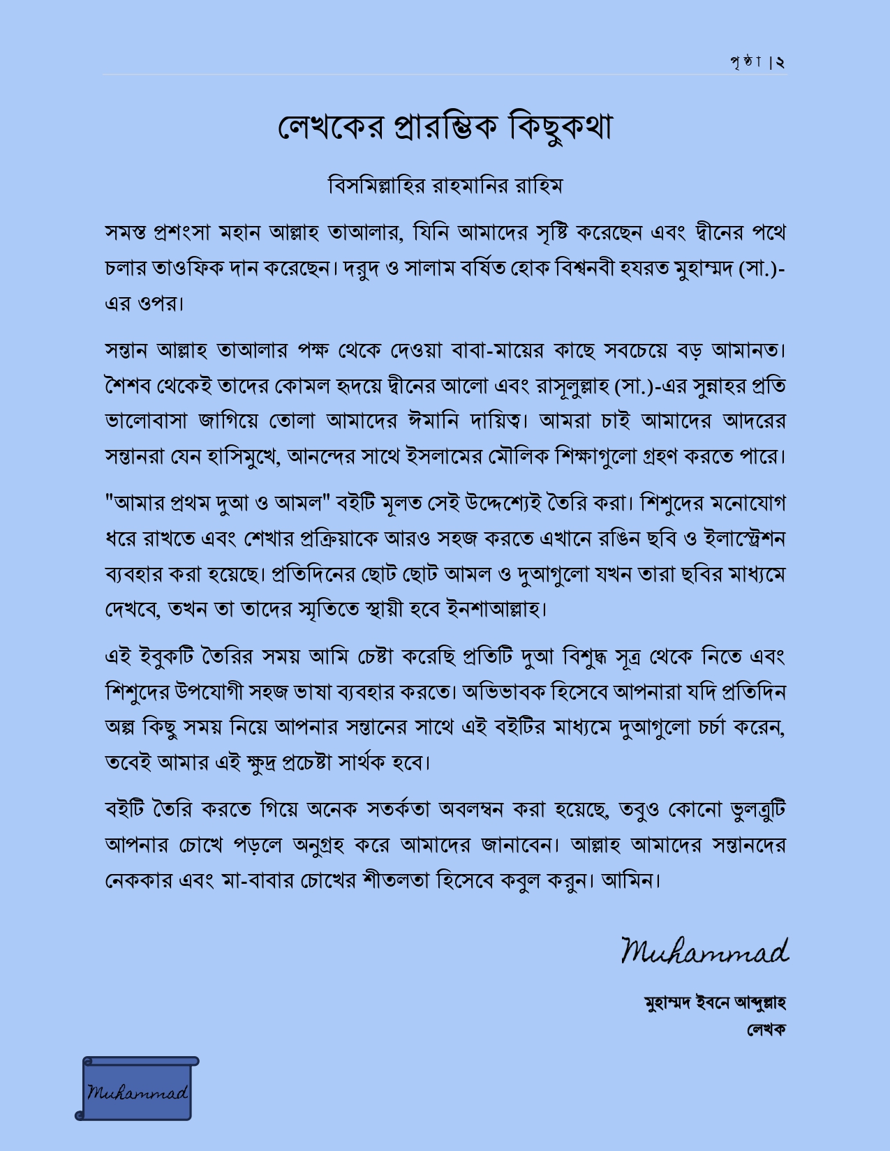 এই ইবুকটি তৈরির সময় আমি চেষ্টা করেছি প্রতিটি দুআ বিশুদ্ধ সূত্র থেকে নিতে এবং শিশুদের উপযোগী সহজ ভাষা ব্যবহার করতে। অভিভাবক হিসেবে আপনারা যদি প্রতিদিন অল্প কিছু সময় নিয়ে আপনার সন্তানের সাথে এই বইটির মাধ্যমে দুআগুলো চর্চা করেন, তবেই আমার এই ক্ষুদ্র প্রচেষ্টা সার্থক হবে।